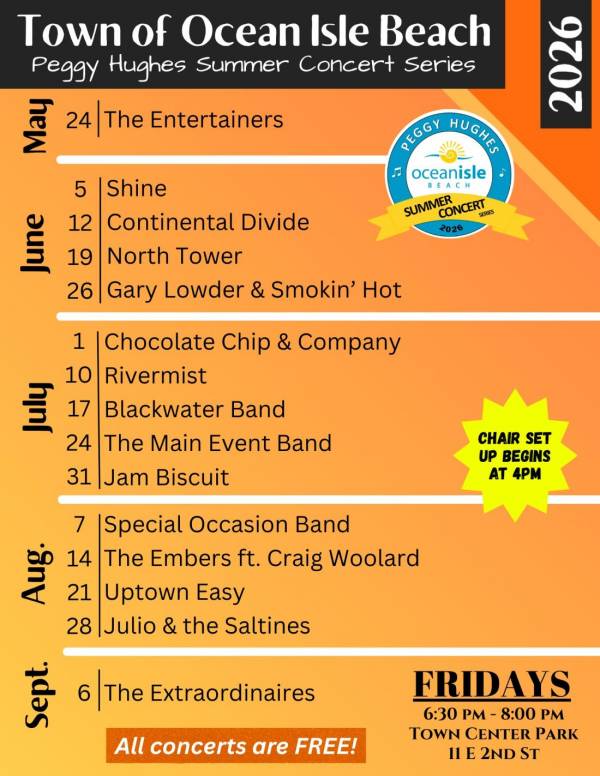 Celebrate summer 2026 in true coastal style at the Peggy Hughes Summer Concert Series in Ocean Isle Beach! Spanning May 24 through September 6, this beloved seasonal tradition brings an exciting mix of musical talent to the stage, offering something for every taste.